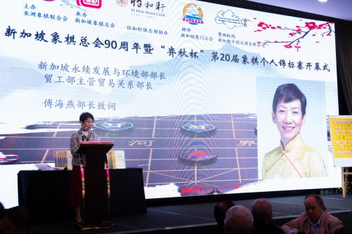 12月2日,开幕式暨新加坡象棋协会90周年晚宴首先在花柏山悦之园举行。新加坡象棋总会会长林关浩先生、亚洲象棋联合会会长霍震霆先生,以及新加坡永续发展与环境部长兼贸易及工业部部长傅海燕女士分别致辞。